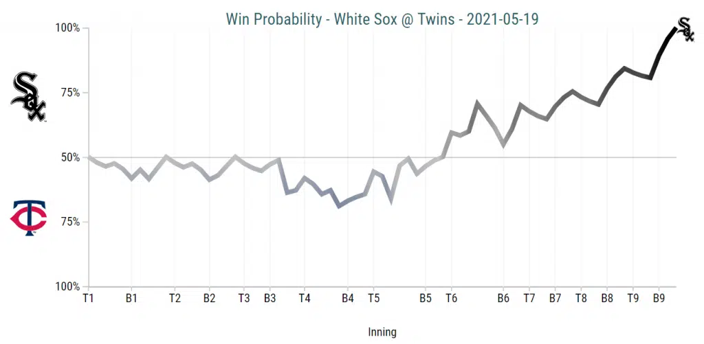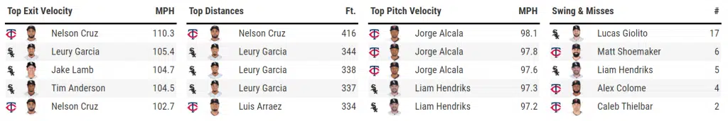 Giolito was dominant, as previously mentioned, generating 17 swinging strikes over eight innings. The only two hits he allowed in the game were to Nelson Cruz. Liam Hendriks came on in relief of Giolito and retired the heart of the Twins’ order 1-2-3 on just nine pitches.