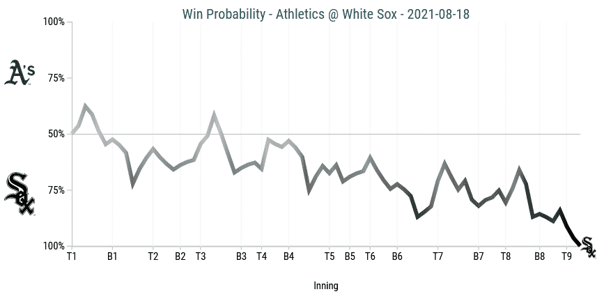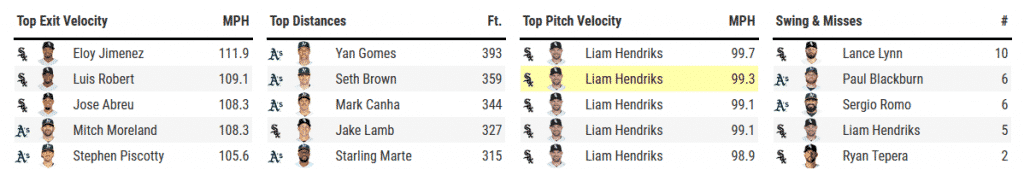Garrett Crochet came in to relieve Lynn and was able to get out of his mini jam in the fifth inning on a double play. After getting to 2 outs with a runner on in the sixth, Ryan Tepera came in to replace Crochet to face righty Stephen Piscotty. Tepera struck out Piscotty to end the 6th inning. However, he faced some adversity in the 7th, as a “triple” off the bat of Elvis Andrus put Tepera in a tough position. After Starling Marte’s sac fly and with a lefty coming up, La Russa called upon Aaron Bummer to finish the inning. He struck out Matt Olson and induced a groundout to end the inning. Liam Hendriks came in after a couple baserunners reached in the 8th. He quickly got out of the inning with groundout and flyout. Liam came back out for the 9th inning to attempt to complete a 5-out save – and did so.