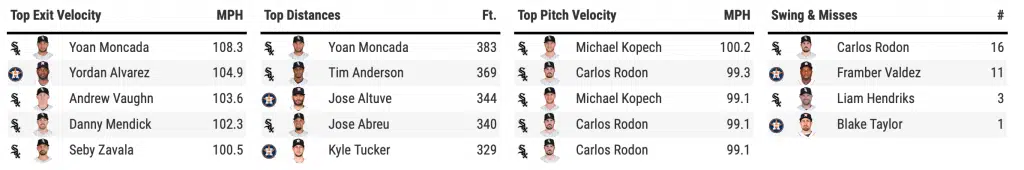 Carlos Rodon was excellent once again, giving up just one hit over seven innings of work. He only allowed that one baserunner as he worked through his outing. As if facing Rodon isn’t hard enough, the Astros were greeted by scoreless innings out of Michael Kopech and Liam Hendriks to close out the game. The Astros would have just the one baserunner all day after scoring just one run off of Lucas Giolito on Saturday night.