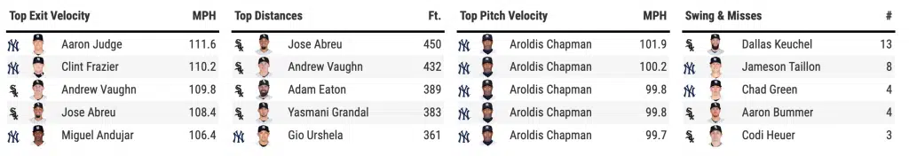 Player of the Game honors are going to Andrew Vaughn in this one. Vaughn had just one at-bat today, as he came in off the bench in the ninth. To hit against Aroldis Chapman is hard enough – to hit a pinch-hit homer as the first run Chapman has given up all season is impressive. Kudos to the rookie.