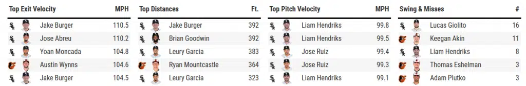 Lucas Giolito had a very strong outing against the Os. The outing was highlighted by a 3rd inning in which he struck out the side, including a 9-pitch at-bat that ended in a strikeout against Cedric Mullins. While he gave up some hits, he was not hit very hard and only walked two. Ryan Burr was tabbed to relieve Giolito in the 6th. Burr struck out Urias, but yielded a single to allow a 2nd run to score. Codi Heuer and Jose Ruiz got some work in today as well. Liam Hendriks came in for his first appearance since Tuesday and got out of a bases loaded, 2-out jam in the 8th inning.