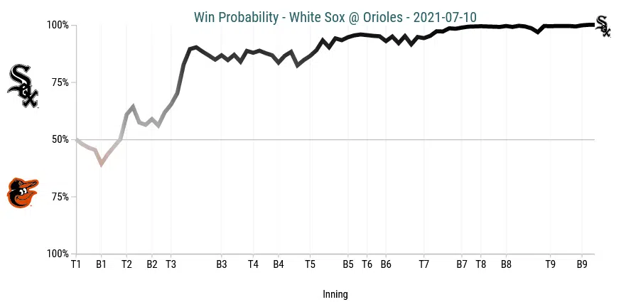Coming off of a rocky start against Detroit, Lucas Giolito had a nice comeback game against the Orioles as we head into the All-Star break. He finished with 16 swings-and-misses, leading to 9 strikeouts. His command was good today as well, with only 2 walks and very few 3-ball counts. He departed with 106 pitches, 68 of which for strikes.