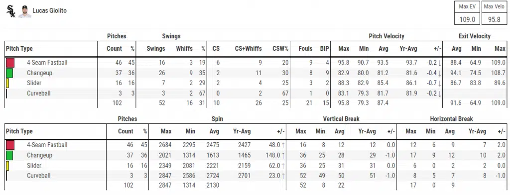 Lucas Giolito: 6 IP, 4 H, 3 ER, 2 BB, 7 K, 16 Swinging Strikes
