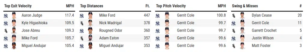 As mentioned above, Cease was out-pitching Cole in the first three innings. He lost control in the fourth and could not find it in the fifth either. On the bright side, he had 20 swings and misses today, as well as only 3 hard hit balls given up.