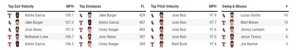 The White Sox struggled to hold onto any lead on Saturday afternoon, as they fell 11-9 to the Rangers. The South Siders got off to a hot start – they scored two runs in the bottom of the 2nd, highlighted by A.J. Pollock and Luis Robert RBI singles, and three runs in the bottom of the 4th, headlined by a Jake Burger 2-run home run (429 feet, 107.3 mph exit velocity). The 5-0 lead would not last long, however.