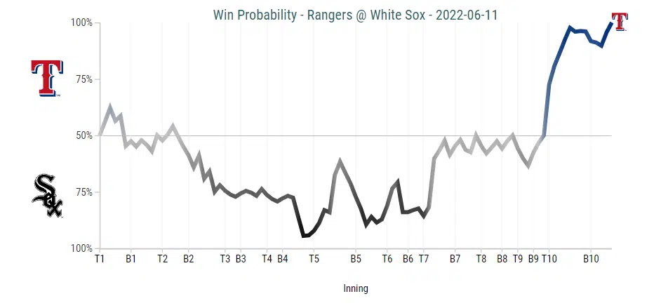 Lucas Giolito went five innings and allowed four earned runs in his 10th start of the season, striking out eight. He blanked the Texas lineup through four frames, but labored in the 5th as the Rangers cut the deficit from 5-0 to 5-4, with the bulk of the damage coming from an Adolis Garcia 3-run laser (407 feet). The White Sox grabbed a three-run lead in the bottom of the 5th, as Reese McGuire and Leury Garcia scored on a fielder’s choice and groundout, respectively.