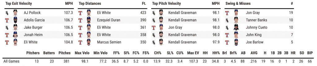 Offensively, the White Sox struggled after scoring early in the first inning. Jon Gray would shut them down until they got to Garrett Richards in the seventh inning. Andrew Vaughn would deliver an RBI single, which would plate two runs—ultimately tying the game. That would be all the offense until the 11th inning when the Sox would score three in a wild frame.