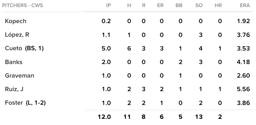 Cueto came out of relief for only the second time in his career and did not disappoint. He kept the White Sox in the game by allowing only three runs across five innings. In what has been a rather disappointing season for the White Sox so far, Cueto continues to be an unexpected bright spot for the team.