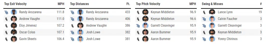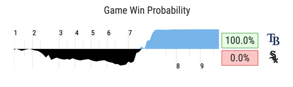 - Bottom 6th: Eloy Jimenez doubles (4) on a sharp line drive to left fielder Randy Arozarena. Andrew Vaughn scores. TB 0, CWS 3