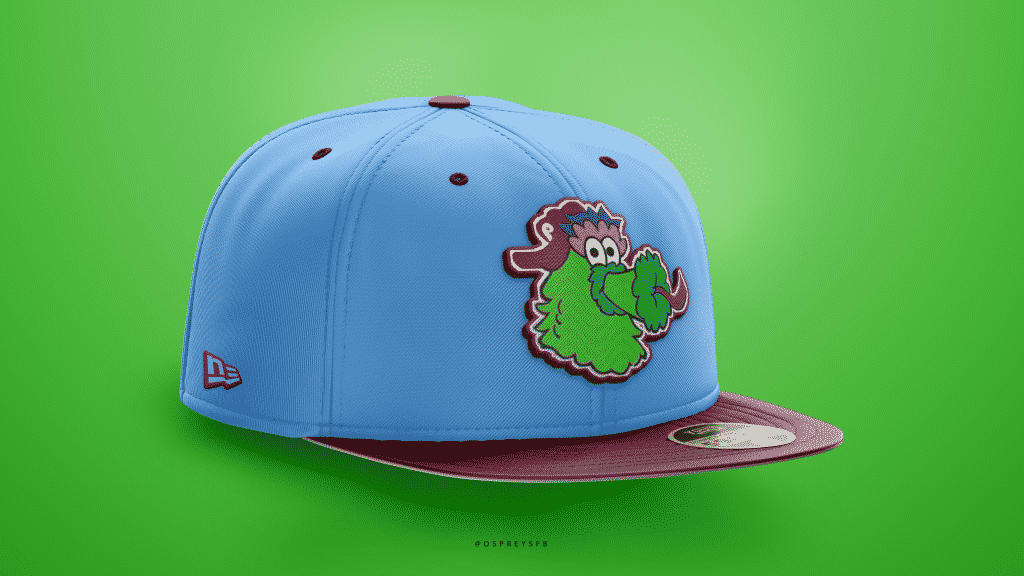 The Phanatic, hands-down the crème de le crème of mascots, is featured on the first cap and this is the one that started the mascot series off. In both Phillies designs here, I used the old maroon and baby blue color set from the 1970s-80s.