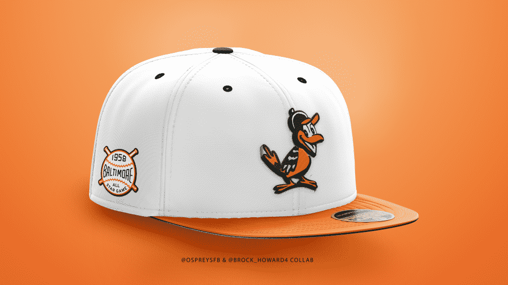 One element I enjoy about sharing designs on Twitter is that I tend to receive legitimately interesting feedback and ideas from fans of whatever team who are being featured and from folks who are even more as passionate about fitted caps as I am. Some ideas I would have never thought of, like this O’s cap that @brock_howard4 provided notes and inspiration for, using an old alternate logo that I cannot remember ever seeing.