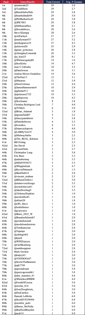 Remember, share your results by tagging us on social media, replying to our tweets about Soxle, and using the hashtag #Soxle. You can make up any days you missed as well – if you want to rise to the top, you’ll need to do all 28 puzzles so far! We have all the archives at the bottom of the page. If you look at the full leaderboard and your score looks off, send me (@jlazowski14) a DM and I’ll make sure to update your scores!