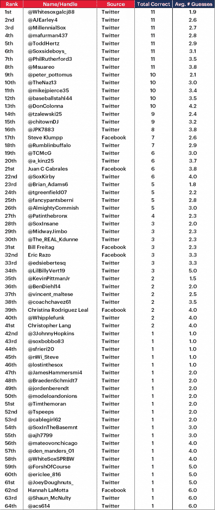 It continues to be more important than ever that you share your results by tagging us on social media, replying to our tweets about Soxle, and using the hashtag #Soxle. You can make up any days you missed as well – don’t fall behind on the leaderboard because you missed a day! We have all the archives at the bottom of the page. If you look at the full leaderboard and your score looks off, send me (@jlazowski14) a DM and I’ll make sure to update your scores!