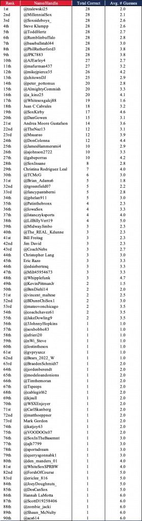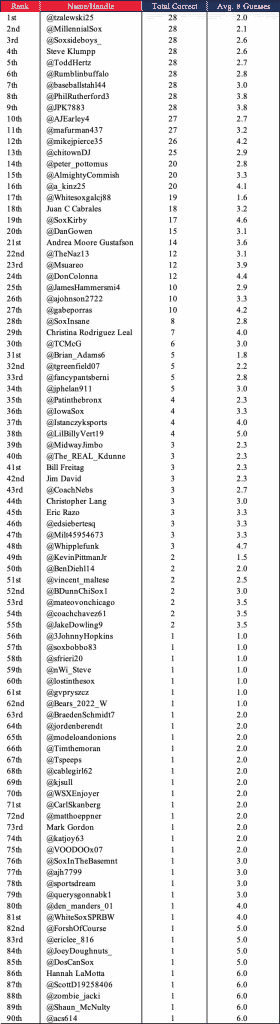 Remember, share your results by tagging us on social media, replying to our tweets about Soxle, and using the hashtag #Soxle. You can make up any days you missed as well – if you want to rise to the top, you’ll need to do all 27 puzzles so far! We have all the archives at the bottom of the page. If you look at the full leaderboard and your score looks off, send me (@jlazowski14) a DM and I’ll make sure to update your scores!
