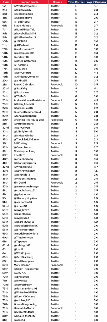 Remember, share your results by tagging us on social media, replying to our tweets about Soxle, and using the hashtag #Soxle. You can make up any days you missed as well – if you want to rise to the top, you’ll need to do all 18 puzzles so far! We have all the archives at the bottom of the page. If you look at the full leaderboard and your score looks off, send me (@jlazowski14) a DM and I’ll make sure to update your scores!