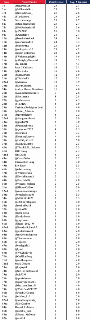 Remember, share your results by tagging us on social media, replying to our tweets about Soxle, and using the hashtag #Soxle. You can make up any days you missed as well – if you want to rise to the top, you’ll need to do all 25 puzzles so far! We have all the archives at the bottom of the page. If you look at the full leaderboard and your score looks off, send me (@jlazowski14) a DM and I’ll make sure to update your scores!
