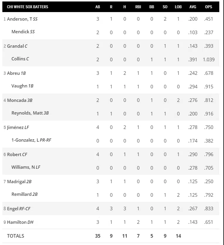 Adam Engel led the charge offensively, going 3-for-4 with a home run and nearly hitting for the cycle. Andrew Vaughn went 1-1 with a home run late to seal the game. Jose Abreu and Eloy Jimenez each collected two hits and an RBI, with Abreu adding a walk as well. Luis Robert and Nick Madrigal both managed a hit, while the surprising performance was from the newly signed Billy Hamilton, who went 1-3 with an RBI double as well as a walk.