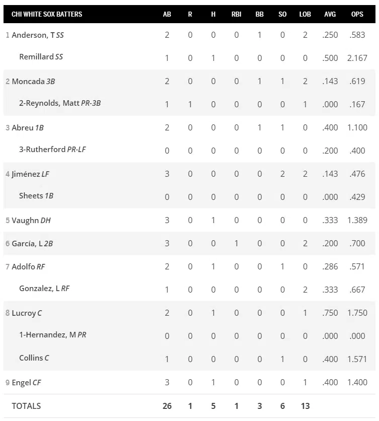 There wasn’t much exciting offense to speak of for the Sox this afternoon, as only 4 total hits were registered. Tim Anderson, Yoan Moncada, and Jose Abreu each registered a walk, while Andrew Vaughn, Jonathan Lucroy, Micker Adolfo, and Adam Engel each produced a hit.