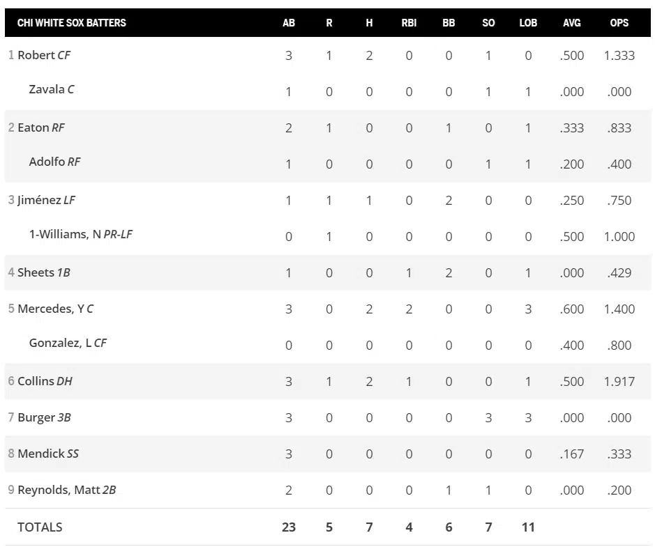 The White Sox scored three runs in the first inning on an Eloy Jimenez RBI single, Gavin Sheets RBI groundout, and Yermin Mercedes RBI single. The Sox added on later in the game via a Zack Collins homer and Yermin Mercedes RBI single.