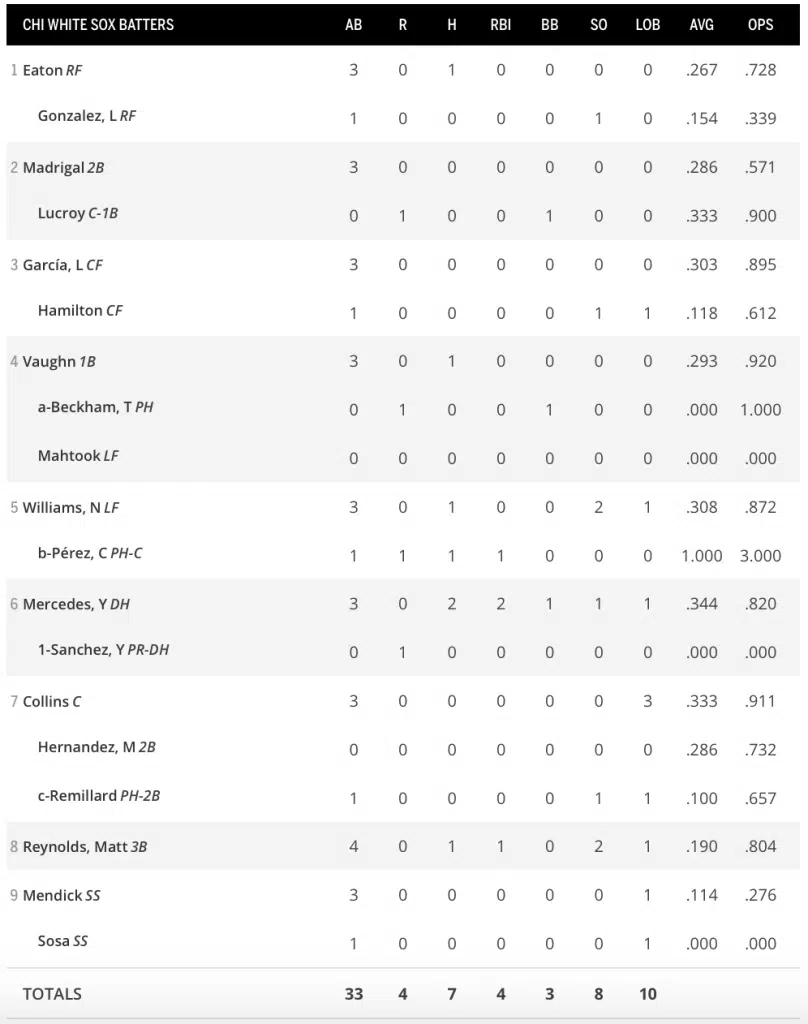 Overall, it was a decent day for White Sox pitching. Carlos Rodon threw four scoreless innings, and Garrett Crochet and Felipe Paulino threw scoreless innings of their own. Reynaldo Lopez, however, continued to have a pretty rough Spring, giving up 4 runs in three innings.
