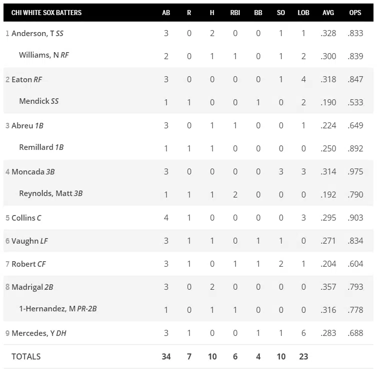 The White Sox offense was limited for the majority of the game until the offensive onslaught in the 8th. Entering the inning trailing 4-1, Danny Mendick led off with a walk. First base replacement Zach Remillard followed the walk with an infield single, and Matt Reynolds drove both in with a gap shot to right-center to put the Sox down by one before a bases-loaded walk from Luis Robert tied the game. Marco Hernandez and Nick Williams followed with RBI singles a piece to extend the lead, and Luis Robert capped the onslaught with a steal of home on a wild pitch.