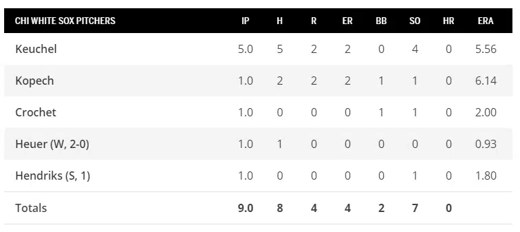 Dallas Keuchel got the start on the bump and struck out four while allowing two runs in five innings of work. He gave way to Michael Kopech in the 5th, whose control faltered at first, but he was able to escape his one inning of work with just two earned runs. The bullpen then completely shut the door as Garrett Crochet and Codi Heuer then each threw a shutout inning apiece before giving way to the closer Liam Hendriks, who picked up the save after protecting the Sox’ 3-run lead in the 9th.