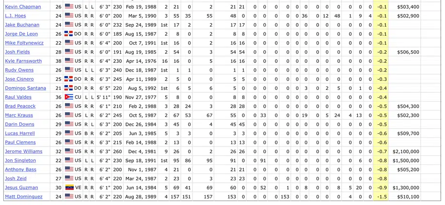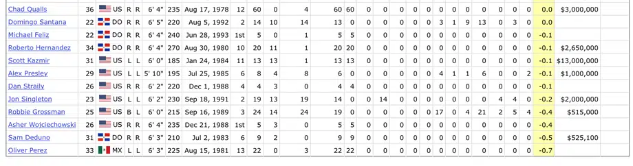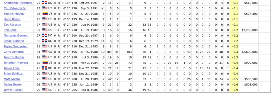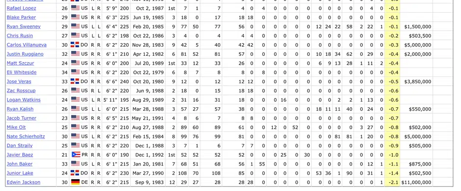 However, in 2015, as we see below, that number shrunk to seventeen players, but more importantly, the cumulative negative bWAR was reduced from 12.8 to just 5.1 negative bWAR.
