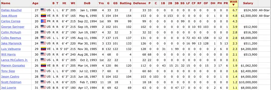 In 2015, we see the Astros had fifteen players at 1.0 bWAR or higher, including five players above 2.0 bWAR. Dallas Keuchel and José Altuve continued to lead the way, and a young Carlos Correa burst onto the scene, producing 4.3 bWAR. The Astros also saw key contributions from newcomers Colby Rasmus, Luis Valbuena and Will Harris.