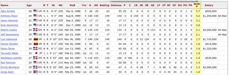 In 2014, the Cubs roster featured six players above two bWAR, and fourteen above one bWAR, including four players above three bWAR. Given this strong production at the top of their roster, it is surprising that the Cubs only won 73 games that year, however, it is important to remember that Epstein traded two of his better arms away early in July, moving Jeff Samardzija and Jason Hammel to the A’s for top prospect Addison Russell. As a result, the Cubs played the final three months of the season without two of their top bWAR producers.