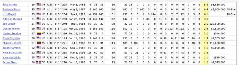Much like the Astros, it was in 2015 that the Cubs broke through. The additions of Kris Bryant and Russell, as well as high-profile starting pitcher Jon Lester through free agency proved to be a big shot in the arm to the continued high-level production of Jake Arrieta and Anthony Rizzo. The 2015 Cubs featured three players above six bWAR, seven above two bWAR, and fifteen at or above one bWAR. Once again, like the Astros and Correa, the addition of a superstar level performer in Bryant as well as other supplemental production led to a huge increase in wins from the previous season.