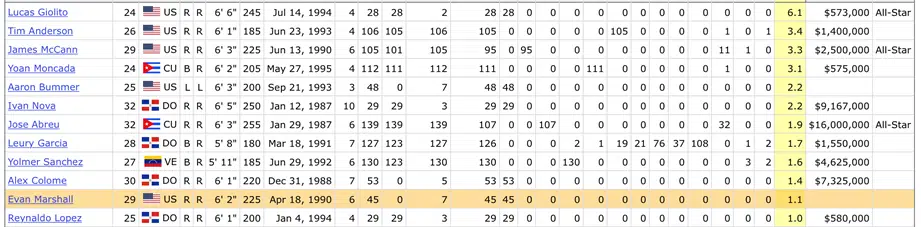 Figure 10 – 2019 Chicago White Sox players below 0 bWAR