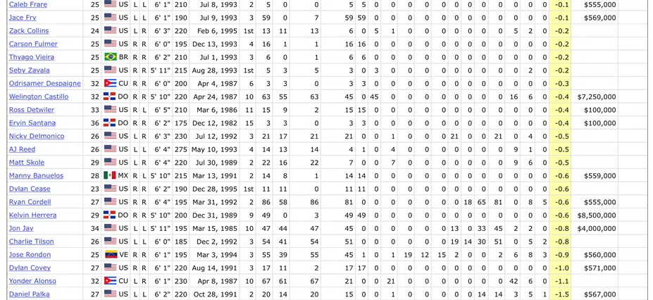 What about negative bWAR from the 2019 White Sox roster? As we see below, the White Sox have featured an abundance of players producing negative bWAR. There will likely be between twenty and twenty three players fulfilling this unfortunate classification, and as it stands today, they have produced a cumulative 12.5 negative bWAR, If the Astros and Cubs are any indication, and perhaps even more importantly for the White Sox than the issue of bringing in positive impact players, is to eliminate as much dead weight and negative bWAR as possible in the 2020 season.