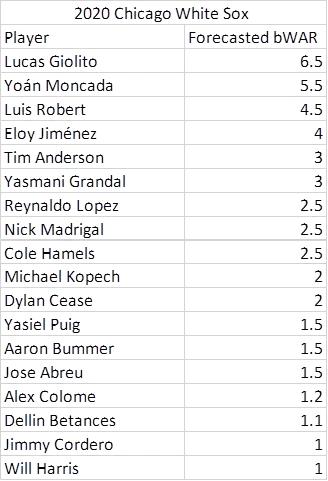 While none of these additions carry the panache of a Gerrit Cole or Anthony Rendon acquisition, they are reasonable signings that fill gaps and carry relatively little risk. If one or two simply don’t work as planned, they will not punish the Organization for years to come. All are short-term in nature, and provide a bridge to the 2022-2025 window when many of the core pieces will be in the midst of their primes. The table below depicts forecasted bWAR (my own) of some of the top 2020 White Sox performers: