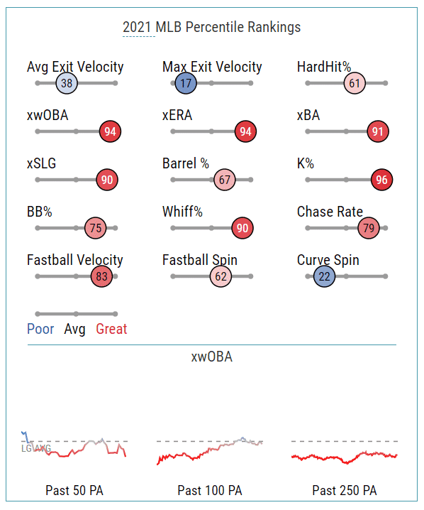 Carlos ranks in the 90th percentile or higher in the entire MLB in strikeout %, whiff %, and expected ERA, expected Batting Average, expected weighted on-base average, and expected slugging %. Those elite metrics are backed by his superb 2.38 ERA, 12.6 K/9, and 0.96 WHIP, resulting in a career-high 4.6 WAR. To put it bluntly: “Los” has been elite this year, and has proven that when he is healthy, he is a devastating pitcher to face. Whether you contribute his breakthrough season to health, mechanical adjustments / working with new pitching Coach Ethan Katz, or vastly improved velocity/command, there is no denying that he is a key cog for this team both now and moving forward. To me, his emergence seems to be a perfect combination of all three of those components, and it will be extremely interesting to see how he pitches down the stretch.