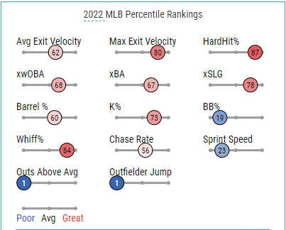 There is a lot of red in the picture, and most of the blue including his Sprint Speed, Outs Above Average, and Outfielder Jump, don’t bother me at all. Andrew Vaughn is slow and a bad outfielder. That’s fine because he was always a 1B/DH anyways that the White Sox are shoehorning a round peg into a square hole making AV play in the outfield.