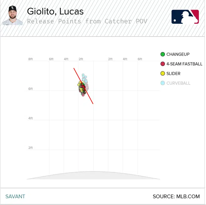 The odd thing is that the change in release point hasn’t changed the movement on his pitches – only the results. My thought is that the release point might make it a bit easier to read out of his hand – this is purely speculative, however. I would like to see Giolito raise his release point a bit more to his 2020 form.