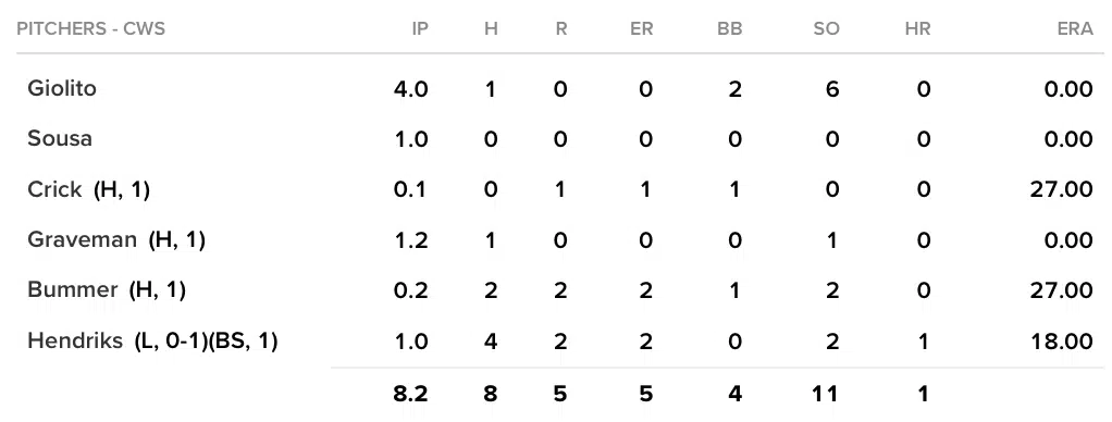 Shoutout here to Kendall Graveman, who looked pretty great on the mound today and, if Aaron Bummer continues to struggle, might find himself trading places with Bummer as the eighth inning setup man to Liam Hendriks.