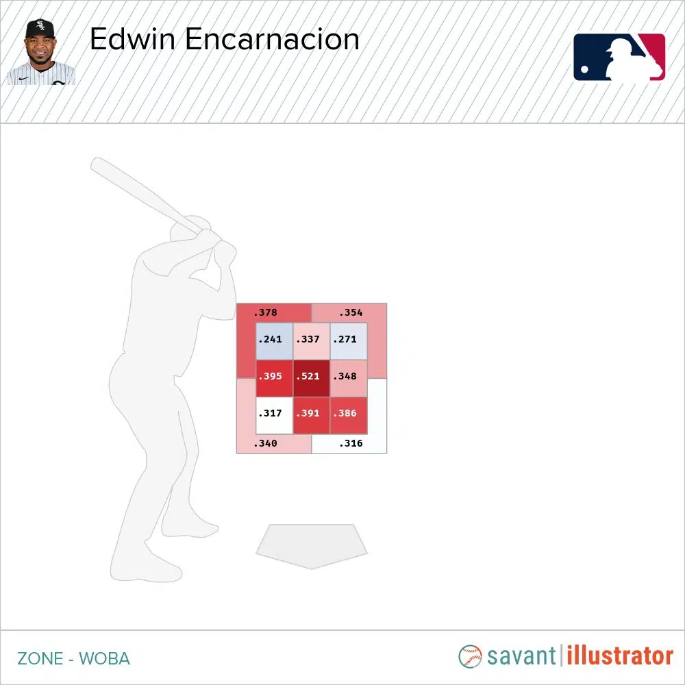 Since 2017, Encarnacion has feasted on pitches that are right down the middle, as well as pitches that are low and away. Take a look at his wOBA in the different sections of the strike zone over the past three seasons: