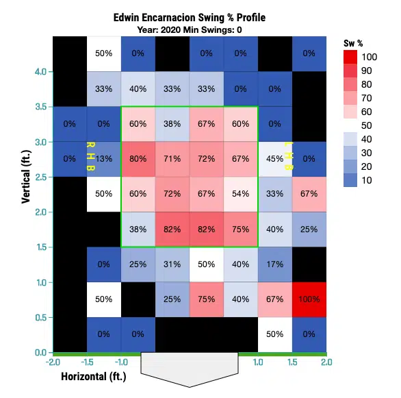 Encarnacion’s inability to hit the pitches he usually does has certainly taken a toll on his 2020 campaign, but any optimists reading this should be able to point out something else about these charts: Encarnacion is mashing pitches in locations he usually doesn’t.