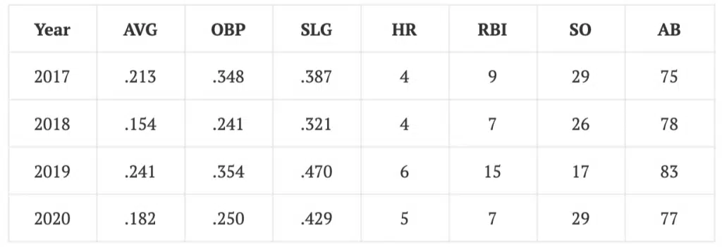 While Encarnacion had a great start last season, these numbers suggest that his poor start to 2020 is fairly normal for him. Of course, a 60-game season doesn’t allow Encarnacion the time to settle in and produce his consistently solid numbers, so let’s take a look at the first 40 games of Encarnacion’s last three seasons. Assuming he keeps up the pace he is on, Encarnacion will play in approximately 40 games this season.