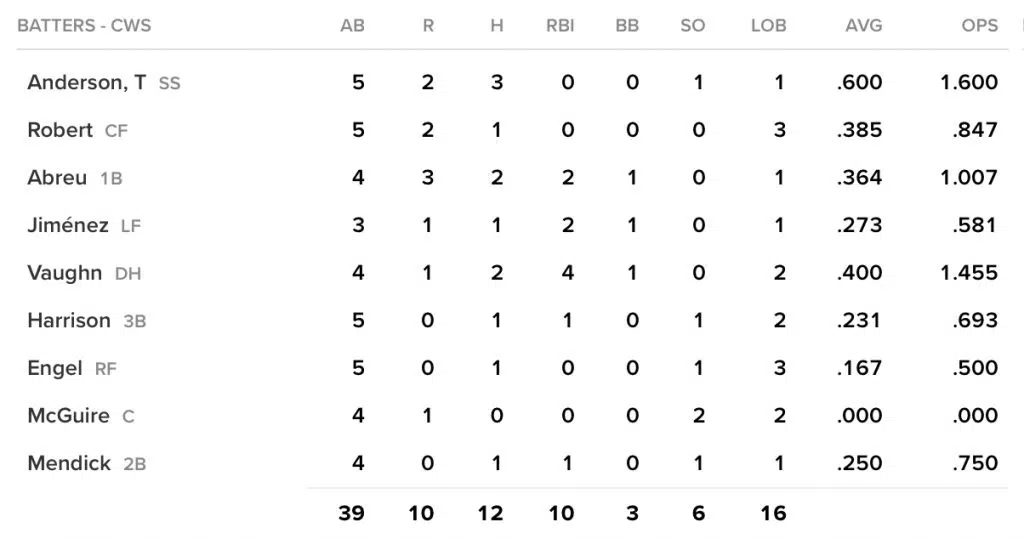 Top 9th: Andrew Vaughn singles to CF, scoring Jose Abreu. 10-1 White Sox