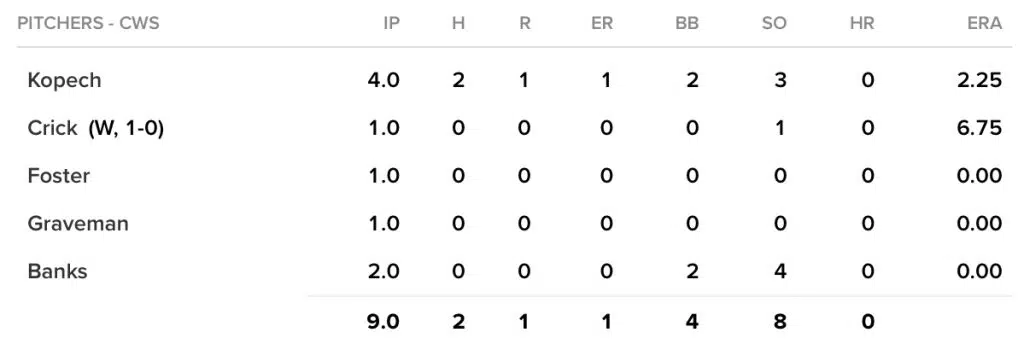 Today was Kopech’s first start of the season, and he was terrific. Kopech went 4 innings, only allowing 2 hits on 1 run, with 2 walks and 3 strikeouts. That makes it three straight solid starts from White Sox starters. Kyle Crick, Matt Foster, Kendall Graveman, and Tanner Banks all threw scoreless innings out the pen today, with Crick getting the win.