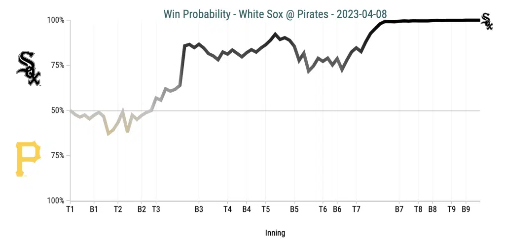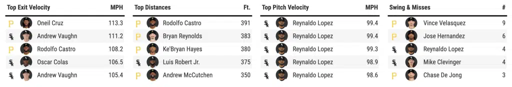 The White Sox’ bats remained alive this evening in Pittsburgh, hammering out 14 hits and using a five-run seventh inning to put the game on ice. The club was able to score 11 runs without the benefit of a home run, led by multi-hit efforts from six hitters: Anderson, Robert Jr., Benintendi, Vaughn, Grandal, and Colas. Every starter except for Yoan Moncada had a hit in today’s effort. The White Sox also stole three bases in the effort, with Colas, Benintendi, and Anderson all adding one to their season totals. It was a night of better clutch hitting as well, with the offense going 7-for-16 with runners in scoring position.
