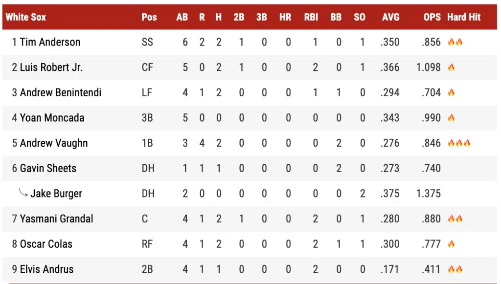 - Top 7th: Luis Robert singles to center field. Elvis Andrus, Tim Anderson score. 11-4 White Sox.