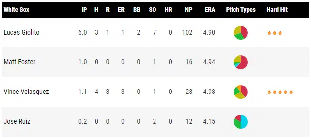 Lucas Giolito completed six innings of one-run baseball on the other side of the ball, completing six innings for the second straight outing. In those two outings, Giolito has thrown a combined 12 innings and given up just three runs (2.25 ERA). He followed up last game’s 71% Whiff Rate on his changeup with a 55% Whiff Rate on the pitch today, with his average fastball velocity sitting just around his season average. He was followed by Matt Foster, Vince Velasquez, and Jose Ruiz, with Velasquez being the only one to give up any runs in the effort.