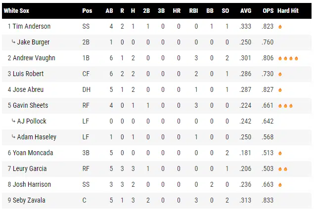 One of many White Sox hitters with a multi-hit game, Vaughn added to his incredible numbers late in this one with a few RBI singles. Vaughn raised his average back over .300 in this game thanks to four hard-hit baseballs on the afternoon.