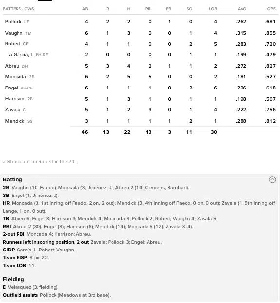 Every player in the starting lineup recorded a base knock, with Adam Engel the last to join the hit parade with an RBI triple in the 6th, pushing the lead into double digits. Moncada led the offensive charge with a five-hit day, Abreu joined with four of his own, and both Mendick and Zavala went deep to combine for four driven in.