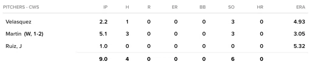 - Davis Martin: 5.1 IP, 3 H, 0 R, 0 BB, 3 K