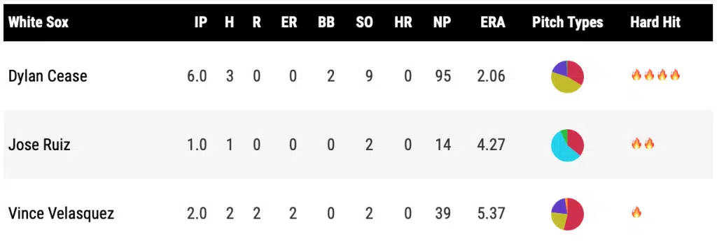 The pitching wasn’t the highlight of the night, for obvious reasons, but Dylan Cease did exactly what he needed to do with such a big lead, hammering the zone and getting quick outs throughout the night. He lost his command a bit in the third inning, which prevented him from going deeper into this ballgame, but at the end of the day, he gave up just three hits and no runs across six innings. He didn’t have his best stuff, but he found it when it counted. After Cease, Jose Ruiz and Vince Velasquez came in to finish off the game, giving the high-leverage arms in the White Sox bullpen a much-needed day off.