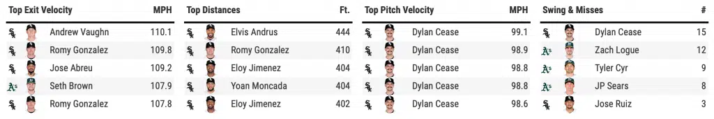 The offense got started early in this one, as Elvis Andrus and Yoan Moncada hit back-to-back homers to lead off the game against Oakland A’s start JP Sears. Even their outs were hard throughout the game, though the offense would be far from over after that first inning. Andrus (RBI single) and Moncada (three-run homer) would strike again in the second inning, pushing the lead to 6-0 early in this one, allowing start Dylan Cease to really settle in without needing to feel too perfect. The offensive party wouldn’t stop there, as Eloy Jimenez would leave the ballpark to make it 8-0, and later in the game, Romy Gonzalez would hit the fourth home run of the day for the White Sox. Within the 21 hits the White Sox posted today were five from Yoan Moncada, who got his day started with a 5-for-5 outing, including a double off the wall in CF that almost became his third home run of the day. When all was said and done, every White Sox starter had at least one hit, while Engel, Jimenez, and Vaughn were the only starters held to one hit.